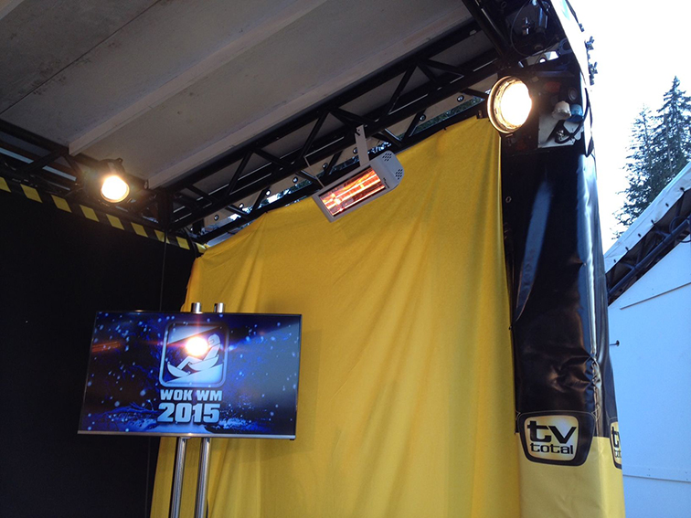 Vier Infrarotstrahler Helios Super Power Titan mit jeweils 2 x 2 KW zur Erwärmung der Bühnenfläche. Etwas über 3,- Euro/ Stunde Energiekosten und das Wetter spielt keine grosse Rolle mehr.